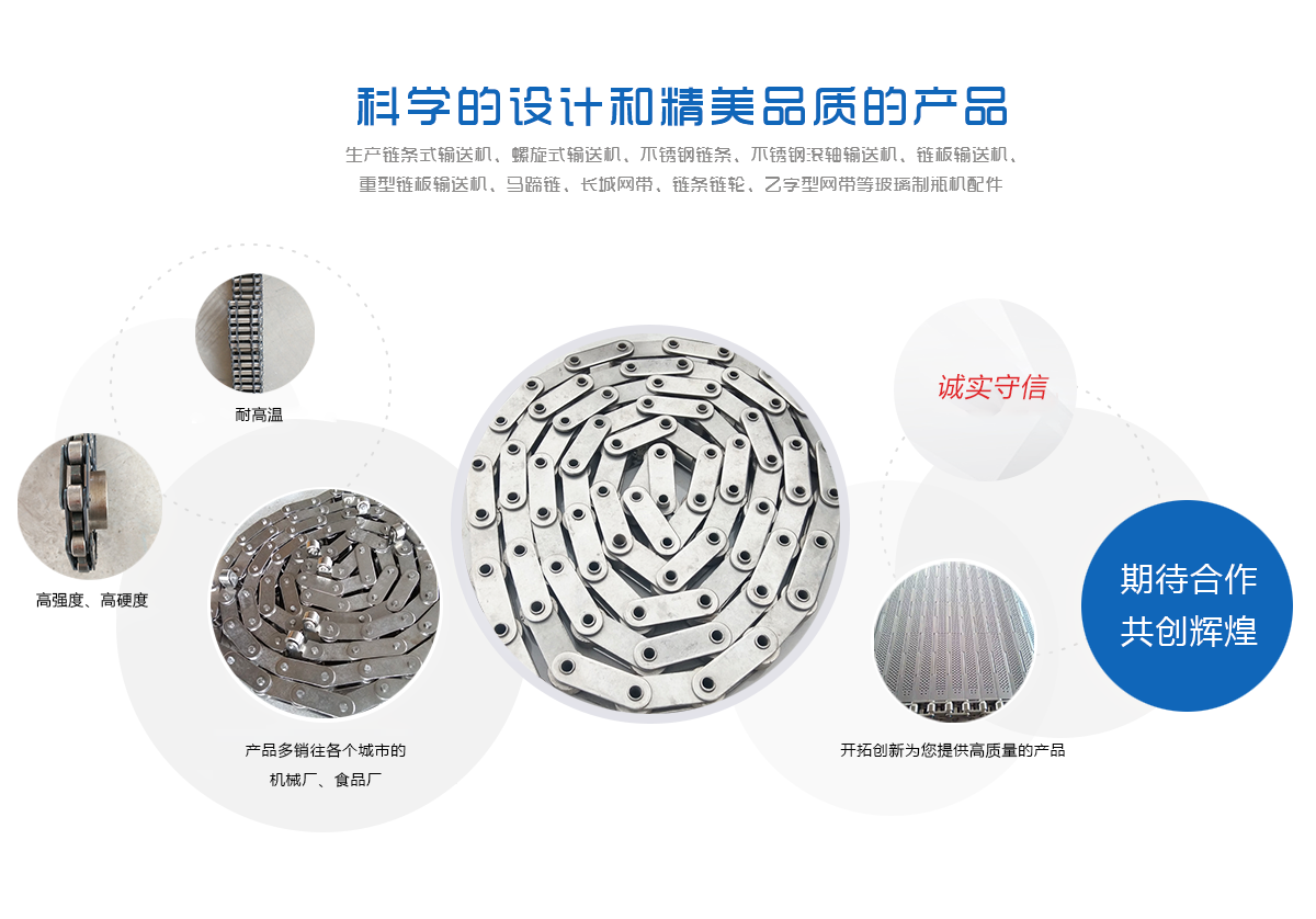 生產(chǎn)鏈條式輸送機(jī)、螺旋式輸送機(jī)、不銹鋼鏈條、不銹鋼滾軸輸送機(jī)、鏈板輸送機(jī)、重型鏈板輸送機(jī)、馬蹄鏈、長(zhǎng)城網(wǎng)帶、鏈條鏈輪、乙字型網(wǎng)帶等玻璃制瓶機(jī)配件,食品機(jī)械配件及各種網(wǎng)帶的專業(yè)廠家 ,多年來(lái)產(chǎn)品暢銷各地玻璃廠和食品廠,在玻璃制品等行業(yè)中享有較高的聲譽(yù)。公司集摸具開(kāi)發(fā)、機(jī)械設(shè)計(jì)生產(chǎn),銷售于一體的生產(chǎn)型企業(yè)。生產(chǎn)的自動(dòng)化流水線金屬傳動(dòng)網(wǎng)帶、鏈條等產(chǎn)品廣泛用于玻璃機(jī)械、食品機(jī)械、化纖機(jī)械、醫(yī)藥、電子、烘干機(jī)械、輪胎機(jī)械等行業(yè)。產(chǎn)品多銷往各個(gè)城市的機(jī)械廠、食品廠和一些涉及流水線或自動(dòng)化設(shè)備的公司。